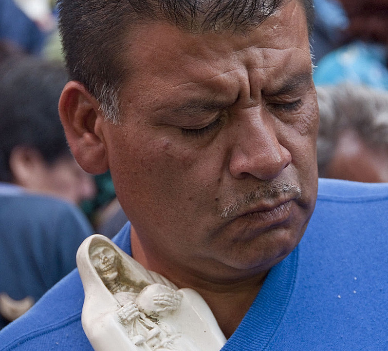 Adorned with an endless array of trinkets, full of offerings and amulets reflecting the Mexican inclination towards idolatry, the figure of death with its scythe summons a large number of people who, in their marginalization, cry out for solace, spiritual help, and in return offer fervent prayers, delirious promises, and desires imbued with fanaticism.