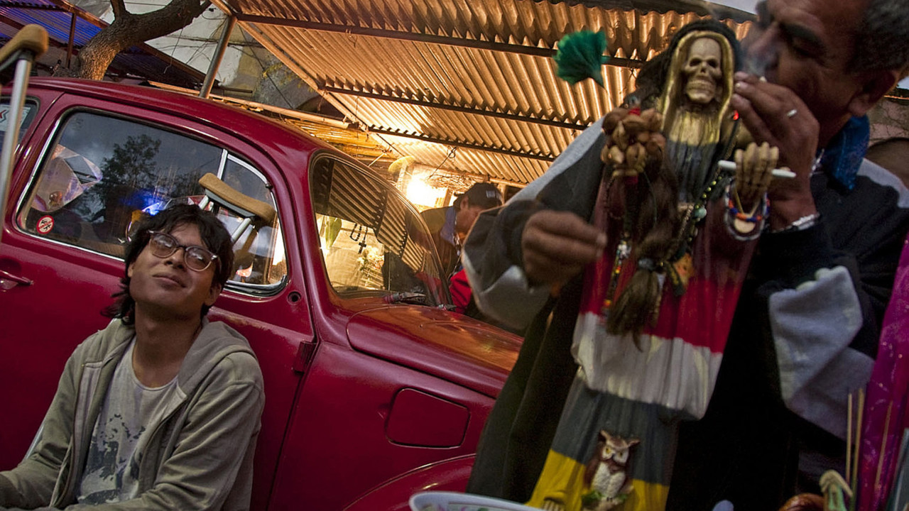 For a few years now, on the first day of each month, an “open-air mass” is celebrated on a street, like so many in this immense city, in front of an improvised temple with the grotesque and skeletal figure dressed in extravagant robes of strident colors, encapsulated in a showcase illuminated with candle and neon lights of various colors.
